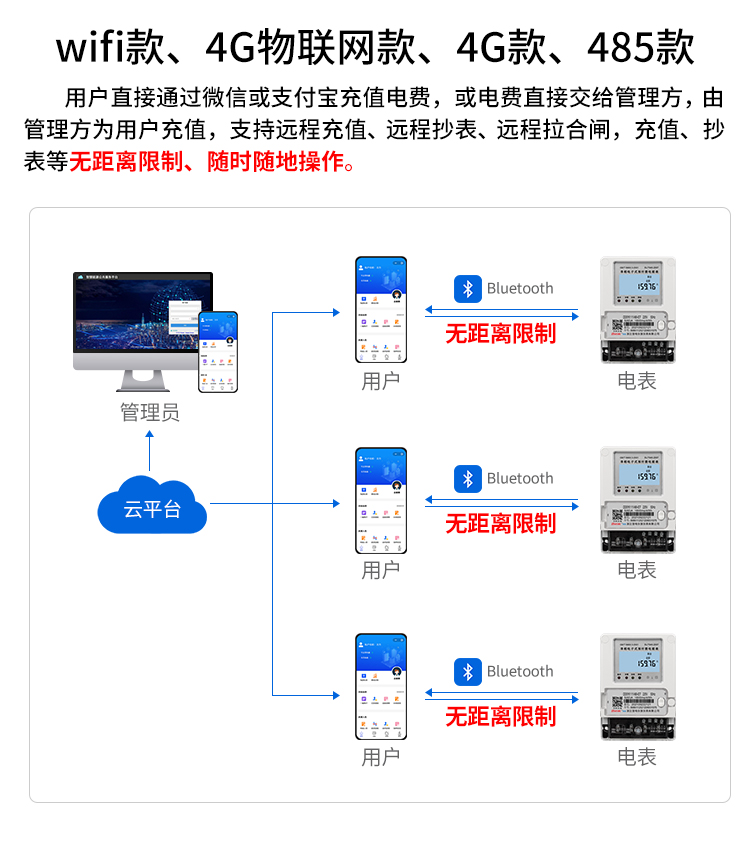系統(tǒng)針對商鋪開戶不僅支持一戶一表,也支持一戶掛多表的需要;同時解決了項目改造后新老表切換時,老表金額轉(zhuǎn)入的問題;支持峰谷電價;可對單表設(shè)置功率過載的閾值,也支持設(shè)置單表金額報警的兩級閾值。