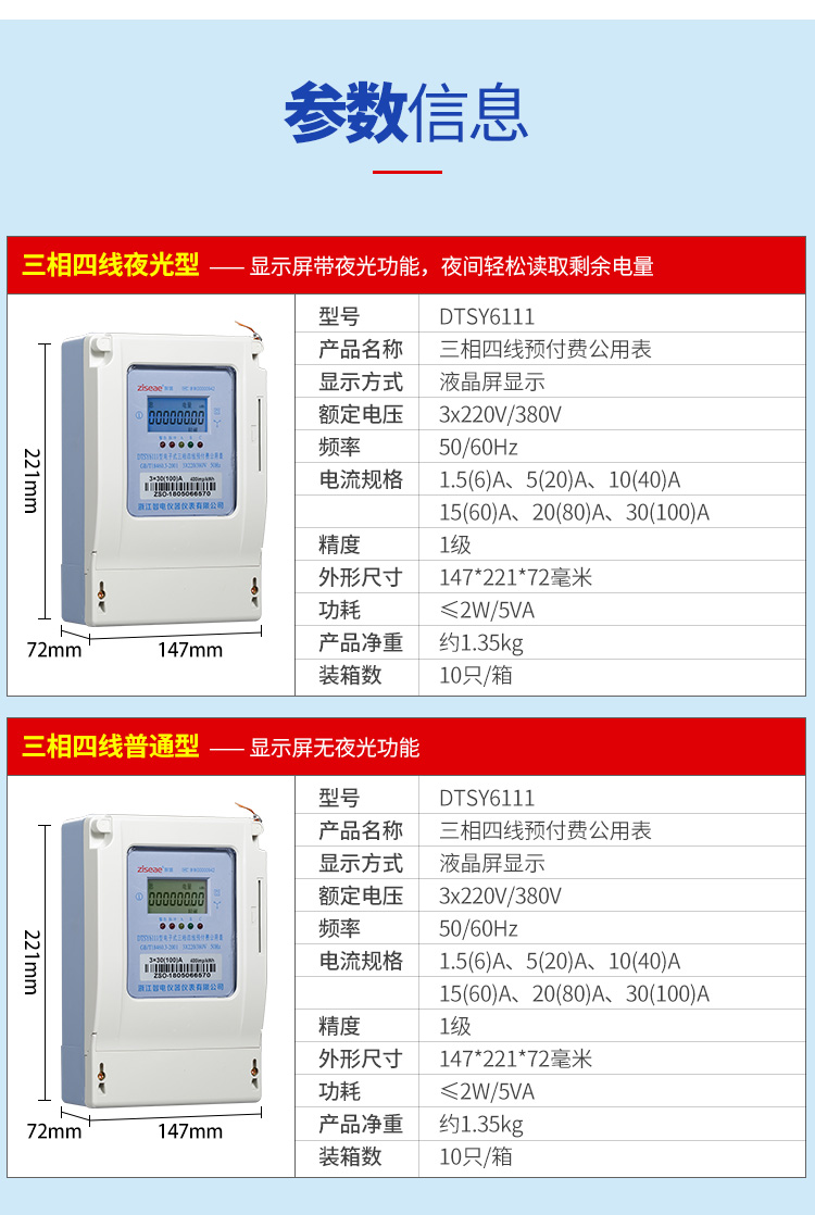 (四)三相預付費電度表(公用表)的參數(shù)信息:產(chǎn)品名稱、顯示方式、額定電流、頻率、電流規(guī)格、精度、外形尺寸、功耗、產(chǎn)品重量,裝箱數(shù)等信息,具體如下