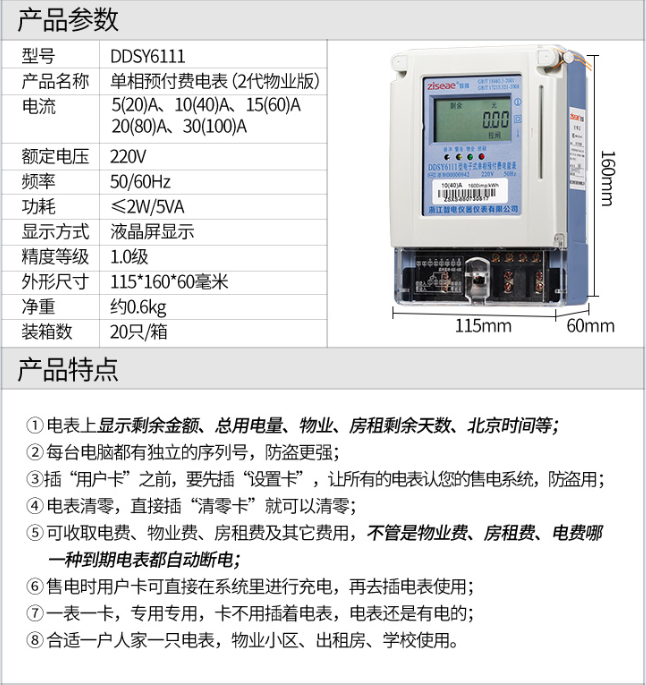 主要特點:應(yīng)用計算機(jī)管理,先購電后用電;在額定電流范圍內(nèi)能限制使用功率(由供電部門限定);一表一卡,專卡專用,失卡不失電,補(bǔ)卡再用;電卡能雙向傳遞數(shù)據(jù),能自動斷電告警用戶購電;電量為零時,自動拉閘斷電;并具有一定的防竊電軟件設(shè)計等。