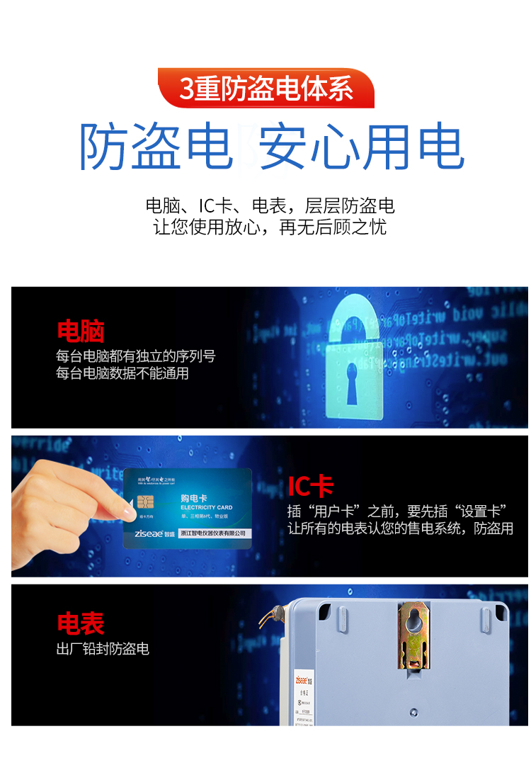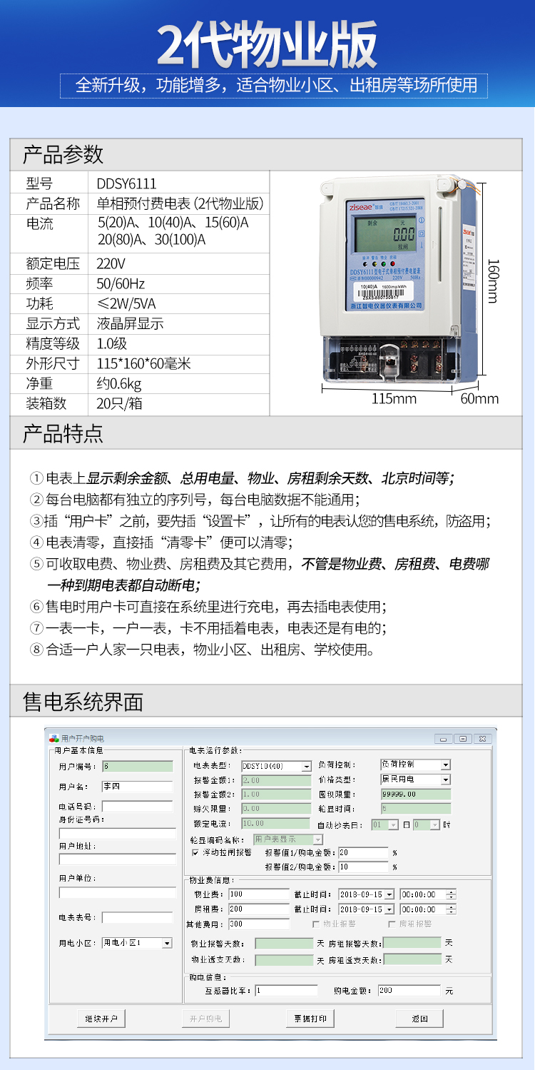主要特點(diǎn):應(yīng)用計(jì)算機(jī)管理,先購(gòu)電后用電;在額定電流范圍內(nèi)能限制使用功率(由供電部門限定);一表一卡,專卡專用,失卡不失電,補(bǔ)卡再用;電卡能雙向傳遞數(shù)據(jù),能自動(dòng)斷電告警用戶購(gòu)電;電量為零時(shí),自動(dòng)拉閘斷電;并具有一定的防竊電軟件設(shè)計(jì)等。