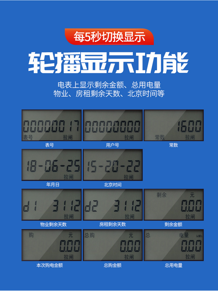 15、 故障申報(bào):剩余電量顯示為零或負(fù)值時(shí),顯示“拉閘”提示符,如電表仍繼續(xù)運(yùn)行,用戶應(yīng)立即購(gòu)電,并主動(dòng)向供電部門反映情況。